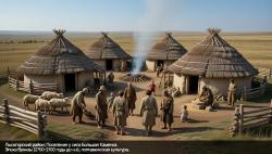 А теперь представьте, как эти курганы и поселения выглядели 4000 лет назад: земляные насыпи высотой 1–3 метра, окружённые рвами, деревянные перекрытия погребальных камер, керамика с орнаментом, бронзовые кинжалы и топоры, кости жертвенных животных. Курганы часто стояли на возвышенностях, чтобы быть заметными издалека — это был способ обозначить территорию и почтить предков. Чтобы лучше понять, как могли выглядеть эти места в древности, мы попросили ИИ сгенерировать реконструкцию типичного полтавкинского кургана и поселения эпохи бронзы в лесостепном Поволжье. Вот как это могло выглядеть: